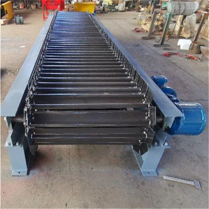 链板式输送机由动力装置(电机)、传动轴、滚筒、张紧装置、链轮、链条、轴承、润滑剂、链板等等构成。其中带动物料的输送的主要的两个部分为:链条,利用它的循环往复运动提供牵引动力;金属板,作为输送过程中的承载体。