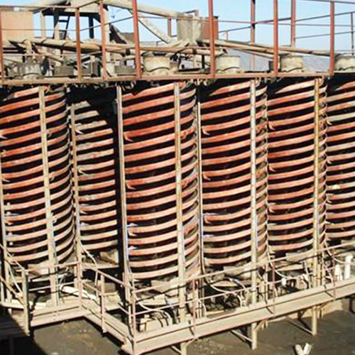 螺旋溜槽由给矿匀分器、给矿槽、螺旋槽、产品截取槽、接矿斗和槽支架六个部分组成。螺旋槽是主要部件。螺旋片是由玻璃钢(玻璃纤维增强塑料)制成,借螺栓联接在一起。玻璃钢螺旋片质轻而坚固。它的选别工作面有一层耐磨层,经久耐用。槽的首端设有多管式给矿匀分器,分矿均匀,控制简便。匀分的矿浆通过给矿柑缓慢地给到螺旋槽面上。螺旋槽的尾端装有阀块式产品截取槽,将已分选的矿流按品位分成几种产品。用调节阀块的位置来改变各产品的截取宽度。接矿斗是一同心环形筒,将已截取的多股矿流按产品分别汇集导出。